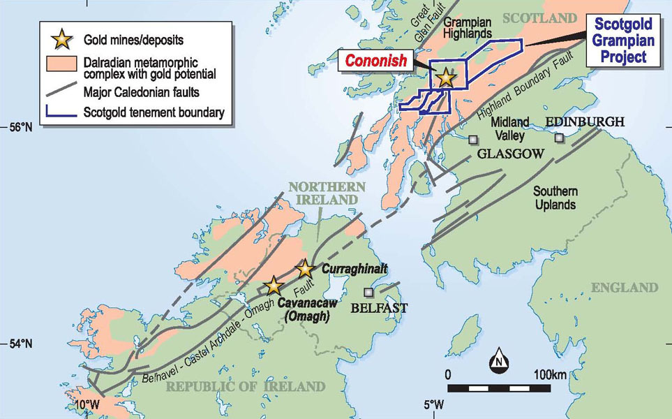 Within Scotland, the large tectonic block known as the Grampian Highlands, bounded by the Great Glen Fault to the northwest and the Highland Boundary Fault to the southeast, is highly prospective for gold and base metals. This terrane, which consists mostly of metasediments and volcanics of Dalradian age, is a direct continuation of the Dalradian gold province of Northern Ireland which hosts the Curraghinalt and Cavanacaw gold deposits.