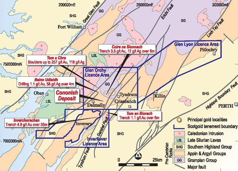 Previous exploration has also identified the Tyndrum-Glen Fyne Fault - one of the major fault structures of the Grampian domain - as a zone of significant potential for lode-hosted gold mineralisation in the Glen Fyne area. Additionally there is also scope for new precious metal and base metal discoveries through the identification of geological settings which, elsewhere in the world, host significant metalliferous deposits. The British Geological Survey (BGS), which has completed geochemical surveys over the entire area held by Scotgold, has repeatedly expressed the view that there are significant metalliferous deposits yet to be discovered in the Dalradian of Scotland.
