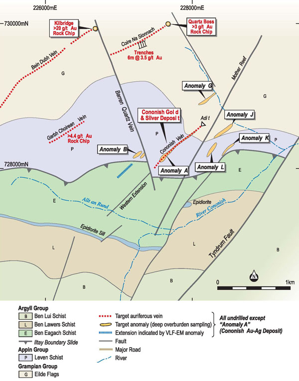 The most favoured structures for gold mineralisation in the Cononish area are the east northeasterly-trending quartz veins including the Cononish vein itself, Coire na Sionnach, Garbh Choirean, and Beinn Dubh, together with several elongate geochemical soil anomalies including Anomaly B. Together these veins and elongate anomalies form a swarm of parallel structures and are interpreted to be of the same age. In brief the exploration targets associated with these structures and anomalies are: