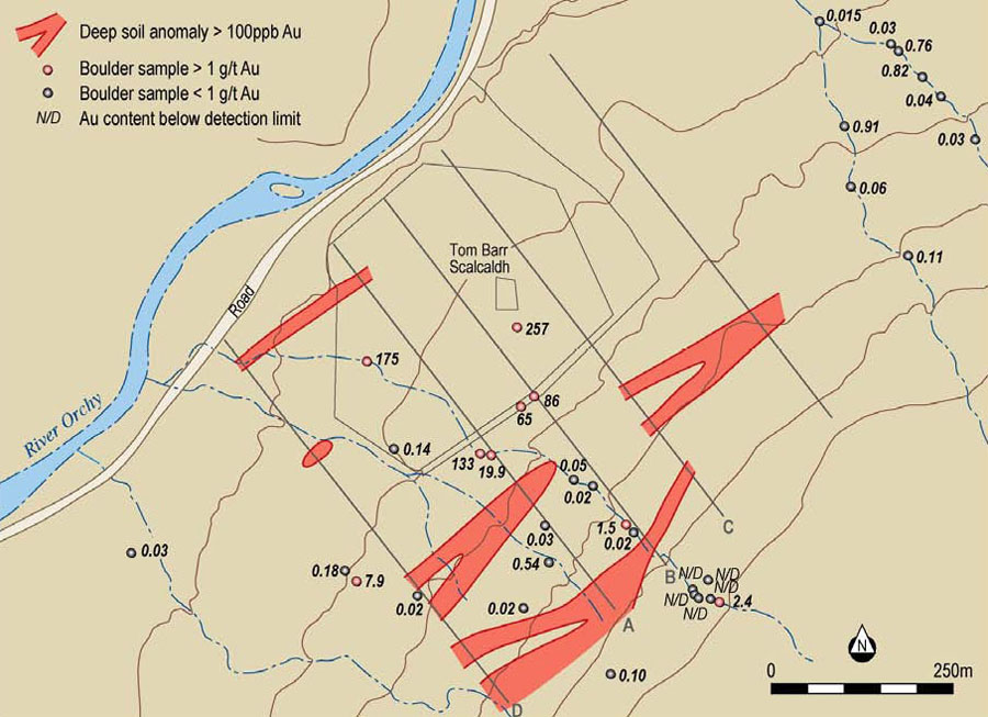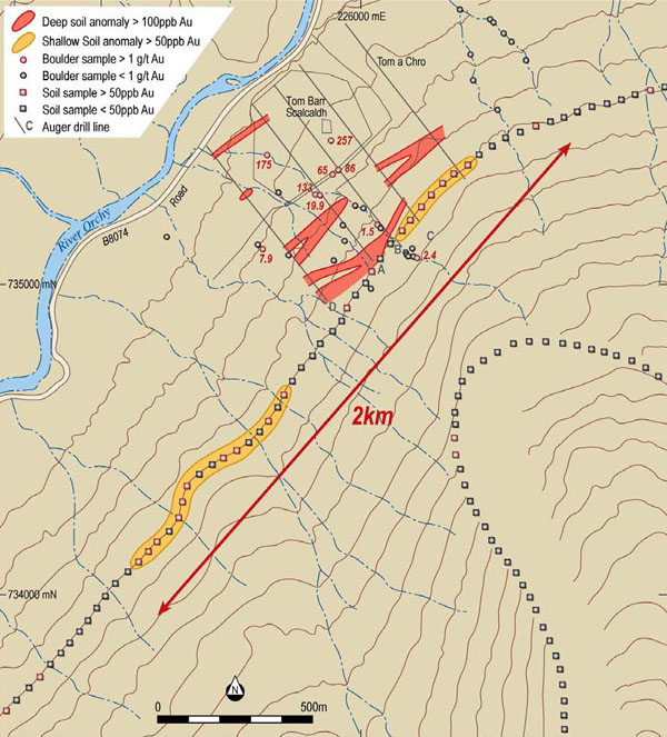 The shallow soil contour anomalies overlap the deep soil auger anomalies but have a considerably longer strike length. Together the two sets of soil data suggest a 2km-long mineralised structure trending NE-SW, parallel to the mineralised vein which hosts the Cononish deposit located about 7 km to the south.