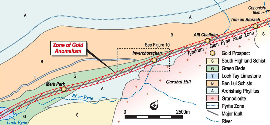 The highest priority for exploration will be given to the outstanding series of prospects within the Tyndrum Fault Zone in Glen Fyne. Within Glen Fyne, which lies along the southern extension of the Tyndrum Fault, a linear zone of exploration potential has been identified. In this narrow valley the Tyndrum Fault intersects Green Beds of the Southern Highland Group and Ardrishaig Phyllite of the Appin Group near their contact with a granodiorite intrusion of Caledonian age. Here the Tyndrum Fault has produced a tectonic corridor in which all of these rock types are commonly strongly sheared, altered and pyritic, and contain extensive linear zones of elevated gold values. This structural corridor within the Tyndrum Fault Zone in Glen Fyne is considered to have exceptional exploration merit.