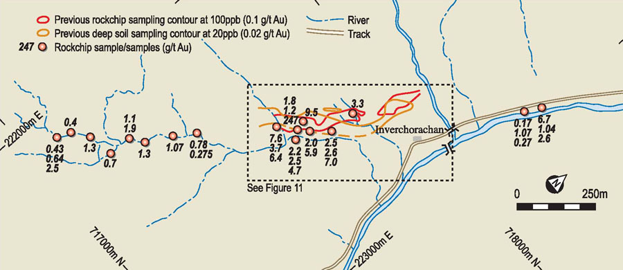 An elongate zone of geochemical anomalism parallel to the axis of Glen Fyne was first recognised from BGS stream sediment sampling, based on Cu, Pb and Zn assays. Subsequent regional rock chip sampling in this area for gold outlined a comparable elongate zone approximately 4.5km long on the basis of gold values exceeding 200 ppb gold (0.2 g/t gold). The highest value in this survey was 1.08 g/t gold and silver values were generally low.